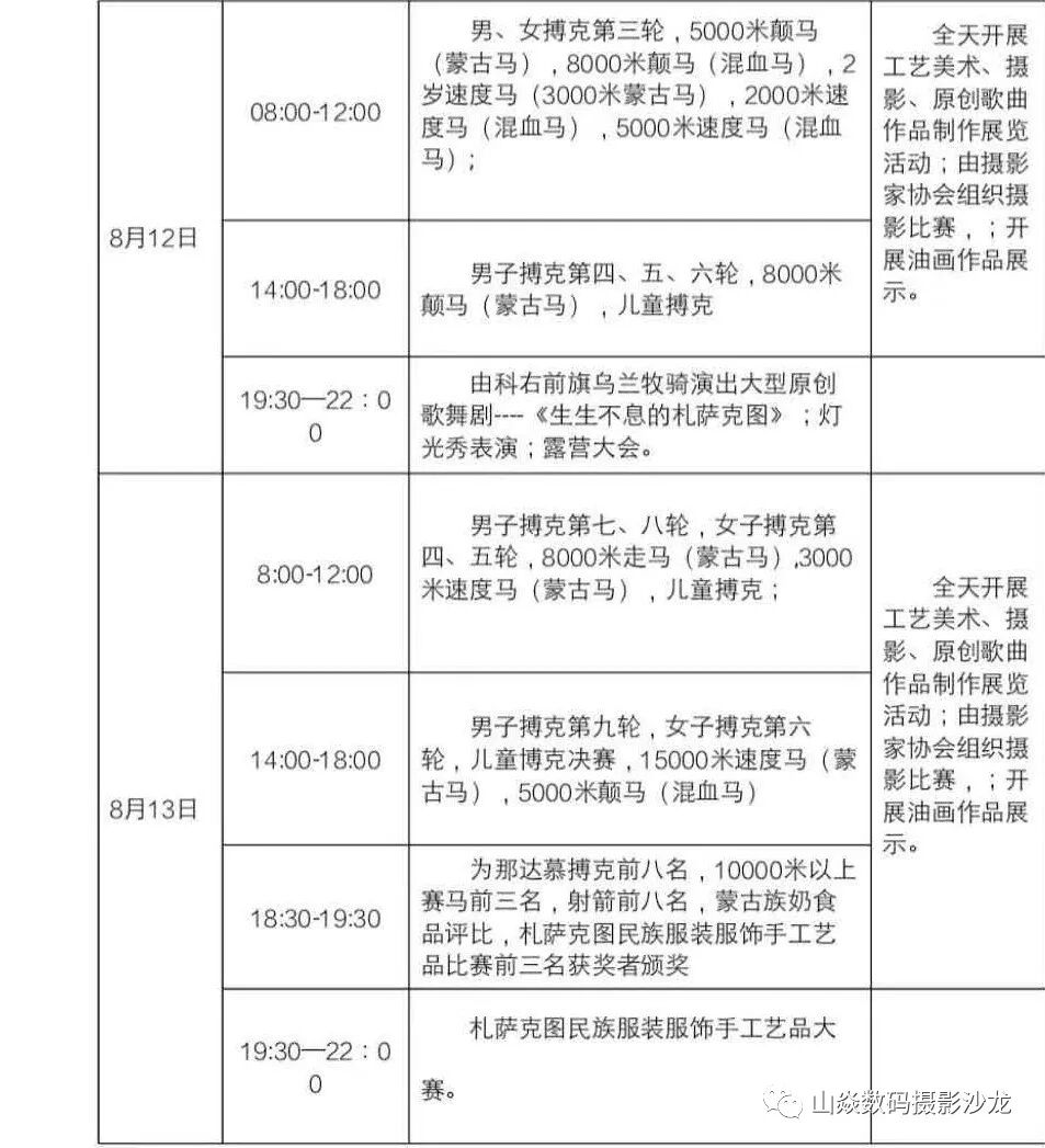 8月13日早餐自备 九曲河日出 乌兰毛都那达慕大会 中餐自备晚上洮儿河夜景 晚上住乌兰浩特